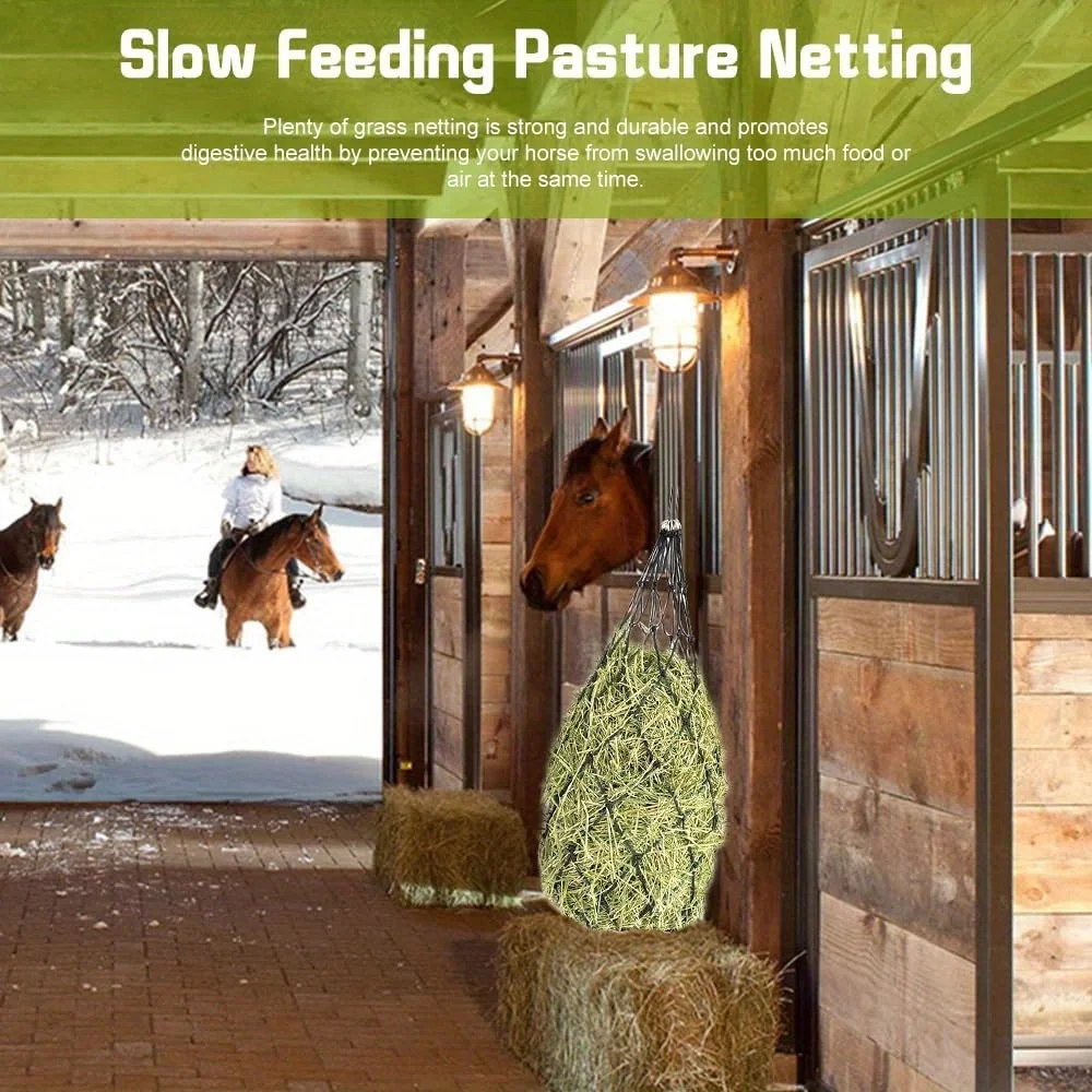 Provide healthier feeding habits with this durable slow feed hay net. The 4-inch hole design helps slow down hay consumption for horses. It promotes better digestion and reduces feed waste. Made from strong and durable material for long-term farm use. Suitable for horses and other large livestock animals. The hanging design allows easy installation in stables or outdoor areas. It helps keep feeding areas cleaner by reducing scattered hay. The breathable net structure keeps hay secure and accessible. Ideal for daily use in barns, farms, and paddocks. Improve your horse’s feeding routine with this reliable haylage net. 🐴